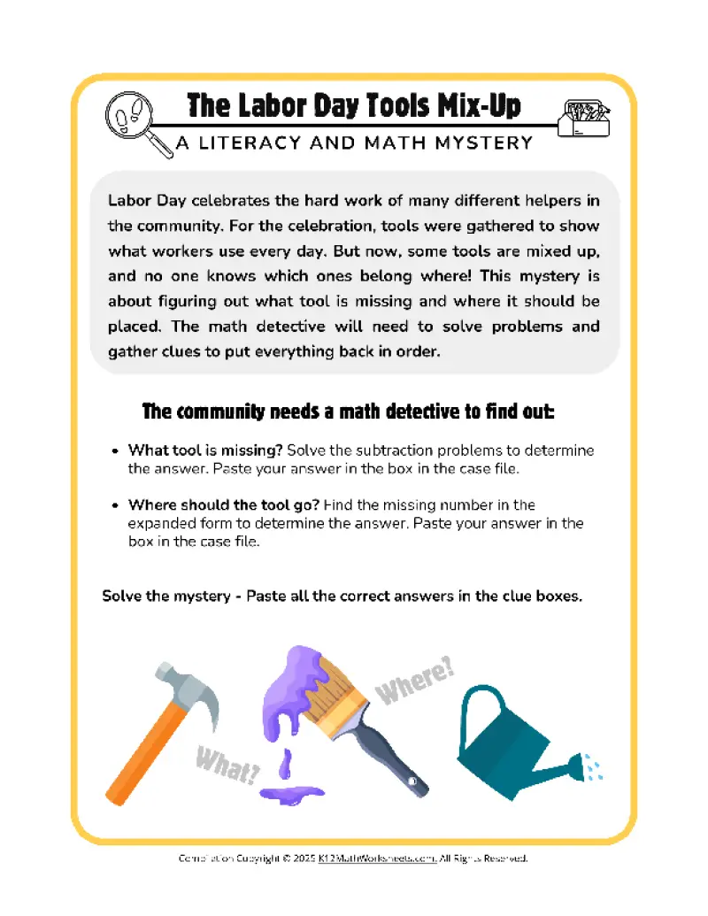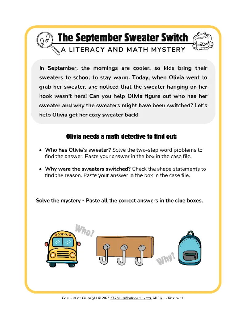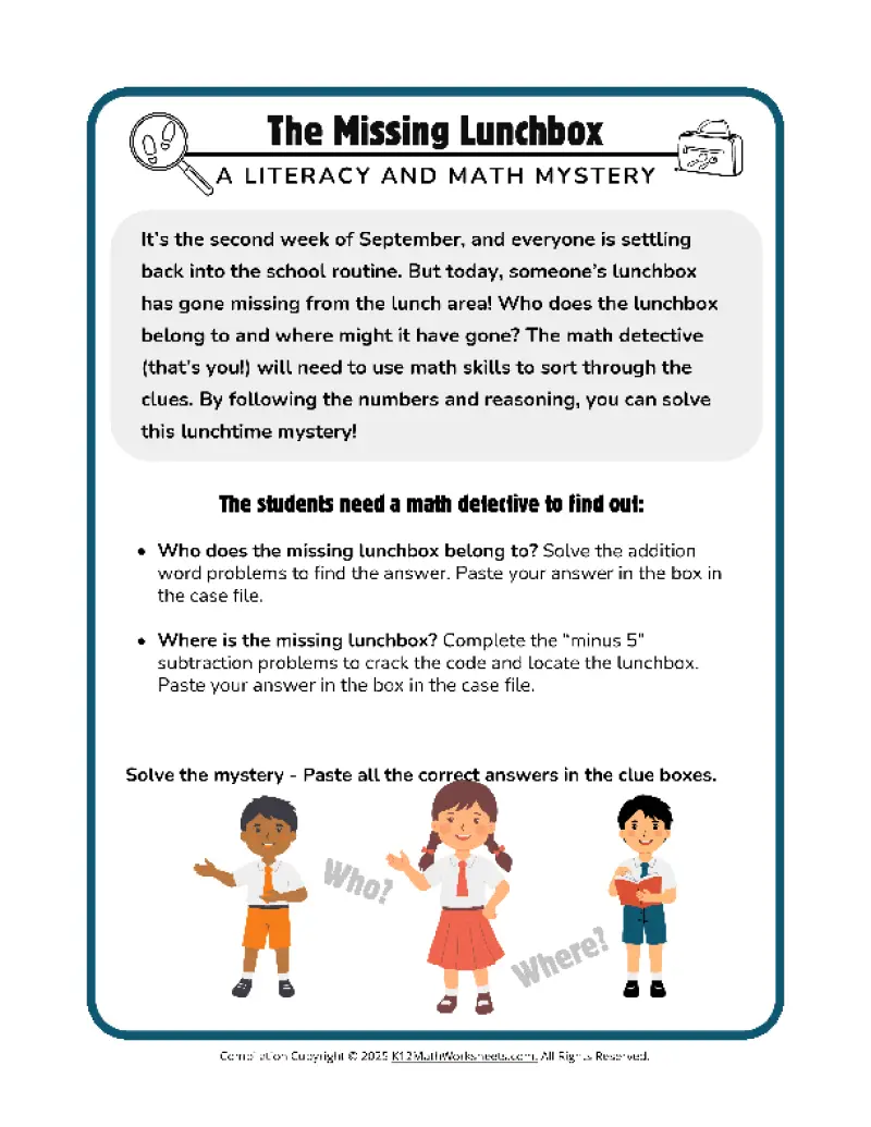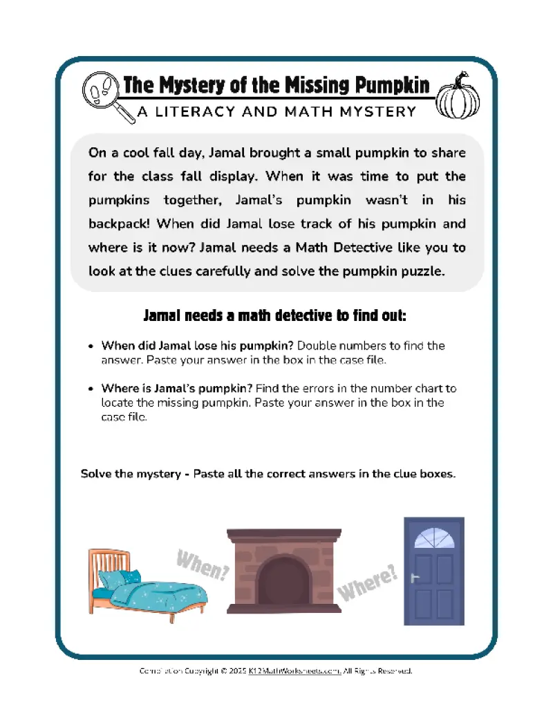 First graders focus on solving problems with missing numbers in a sequence, recognizing even and odd numbers, and understanding basic addition and subtraction. These math mystery activities challenge students to identify missing numbers, distinguish between even and odd, and strengthen their fact fluency. By integrating math puzzles with fun themes, students remain engaged while developing critical thinking and math skills.