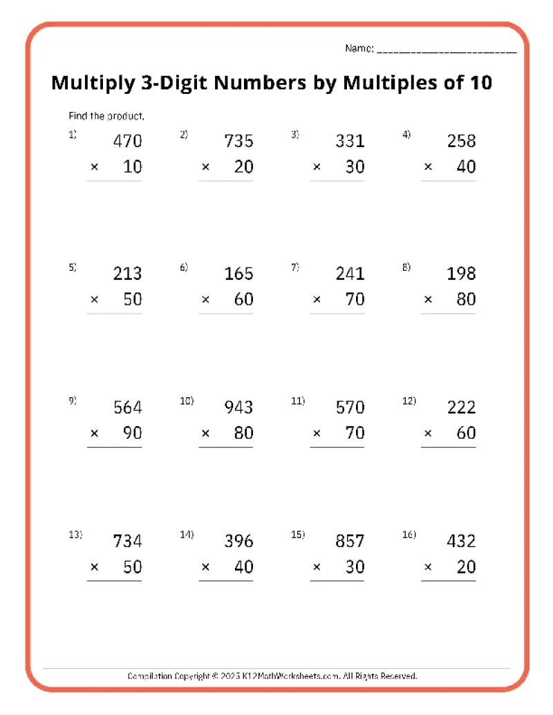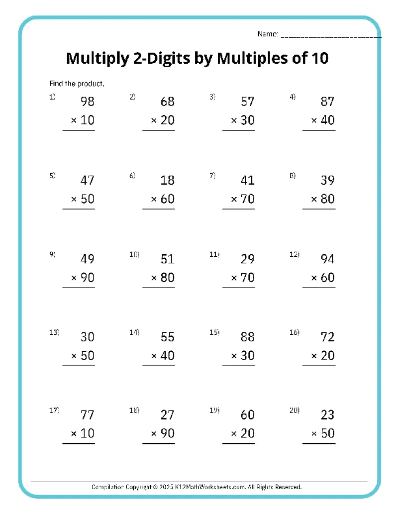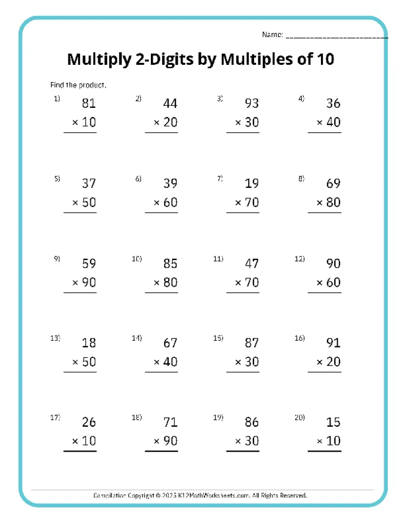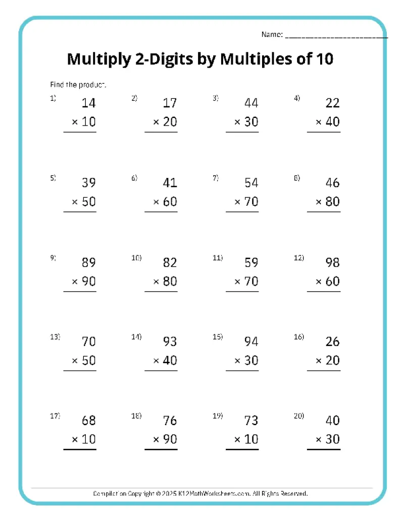 Topics include 2-digit by 1-digit multiplication, 2-digit by 2-digit multiplication, multiplying with whole tens, hundreds, and thousands (10, 100, 1,000), and 3-digit multiplication. Each worksheet is available in easy-to-print PDF format, making them perfect for classroom activities, homework assignments, or extra math practice at home. Help your 4th grader build confidence and accuracy in multiplication today!