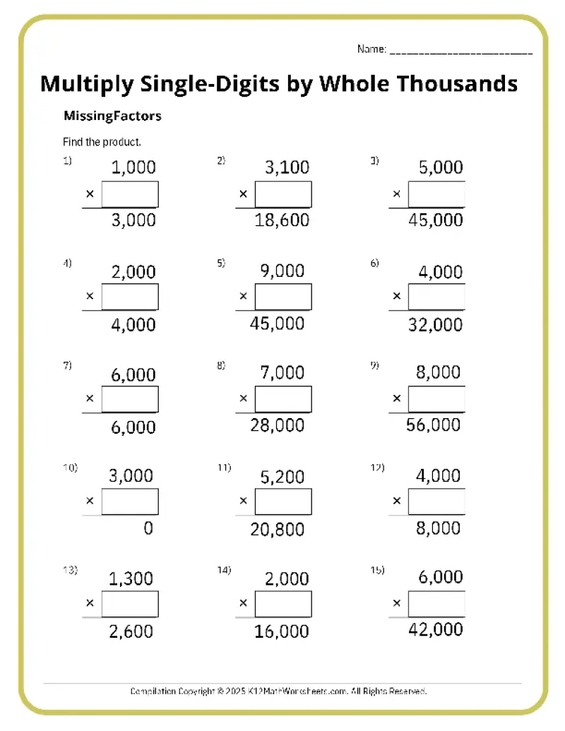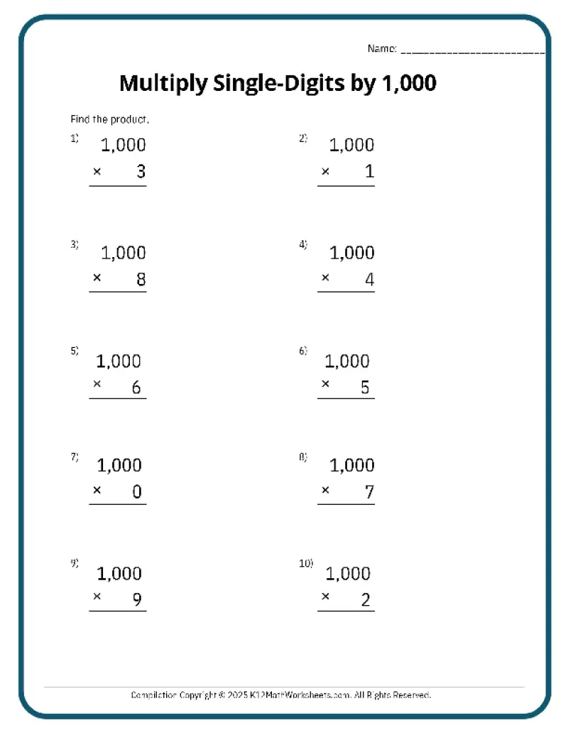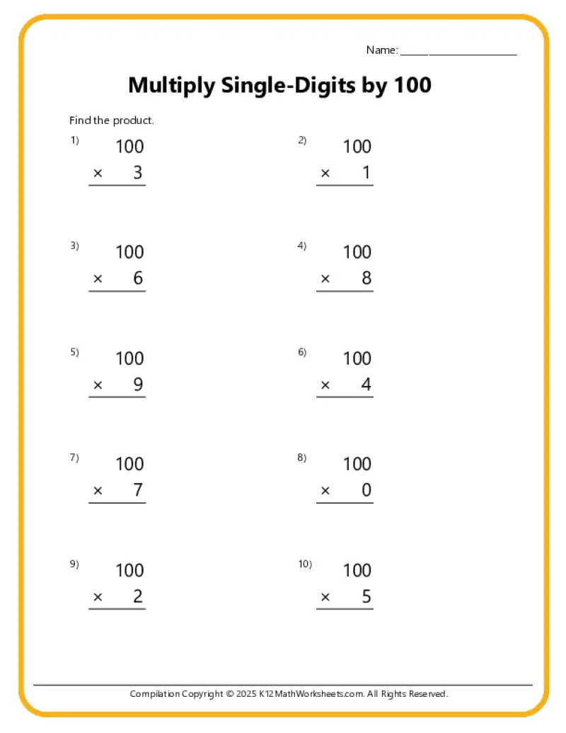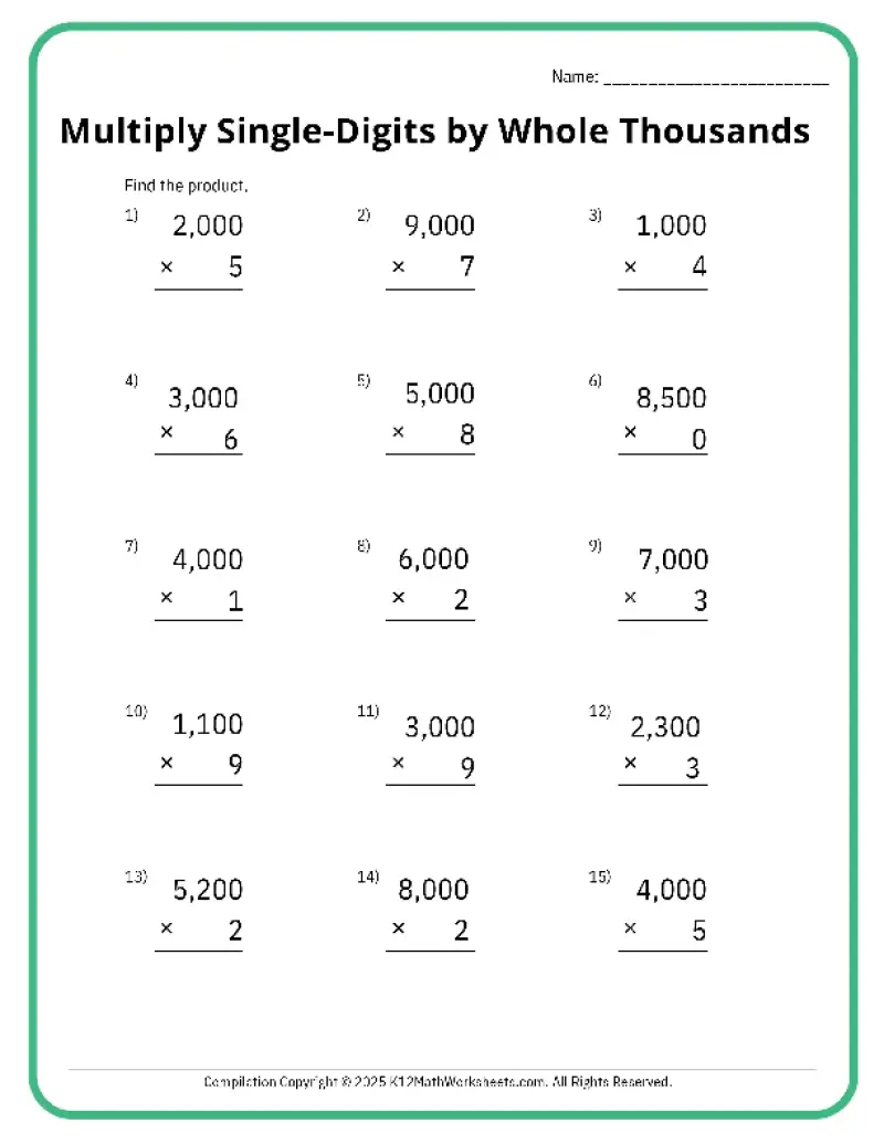 This worksheet section provides practice for multiplying single-digits by 10, 100, and 1,000, whole 10s, whole 100s, whole 1,000s, and multiplying whole 10s by whole 10s.