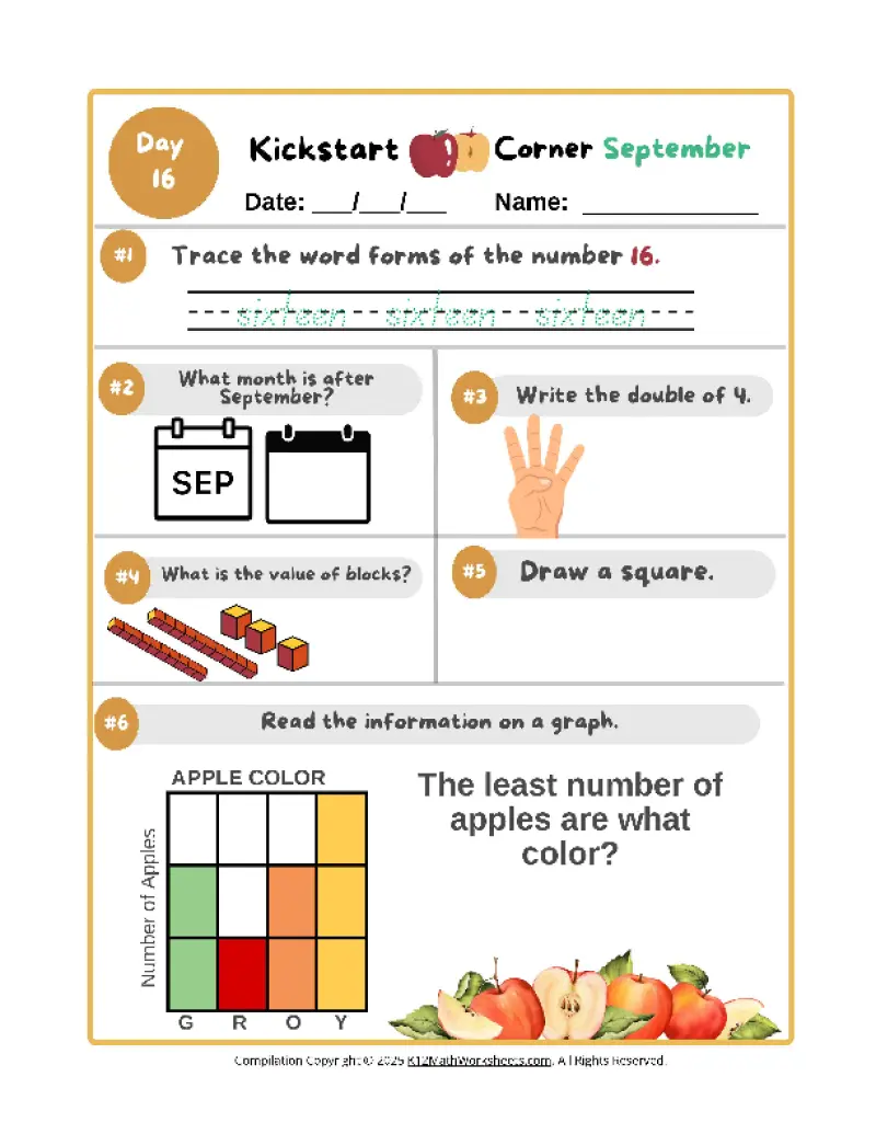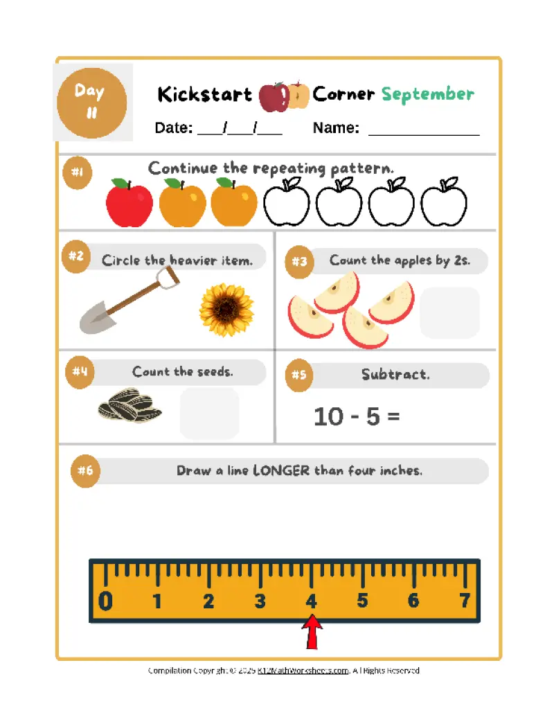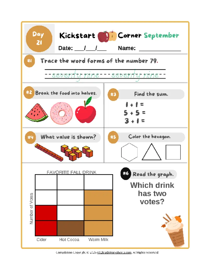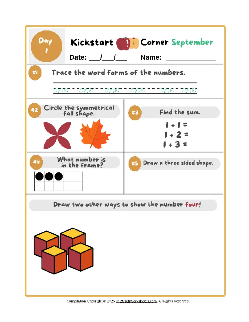 In Kindergarten, Kickstart Corner focuses on key skills like counting, number recognition, and basic addition and subtraction. Students will work on identifying shapes, sorting objects, and exploring simple word problems. These activities are aligned with Common Core Standards such as K.OA.A.2 (Solve addition and subtraction word problems) and K.CC.A.1 (Count to 100 by ones and tens). Through interactive and visual tasks, students develop a solid understanding of early math concepts while building problem-solving skills.